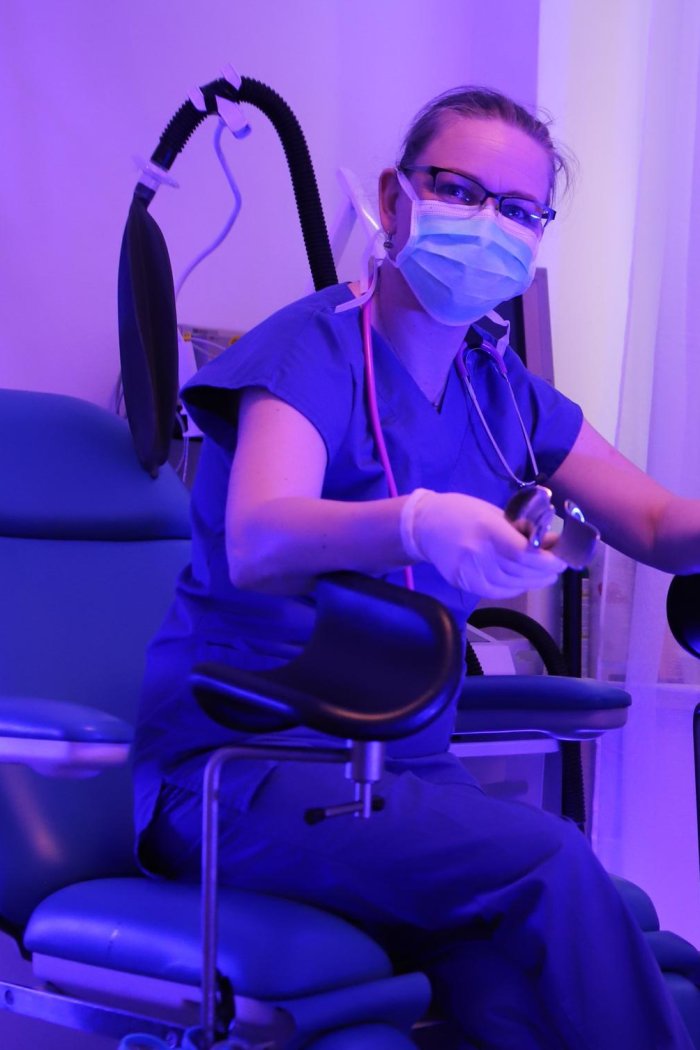 Private Clinic Author pro náročné klienty Diskrétní prostředí určené pro muže, kteří oceňují preciznost, kontrolu, profesionalitu a psychologickou hloubku. Studio je vybaveno moderním elektrickým polohovacím vyšetřovacím křeslem, funkčním monitorem vitálních funkcí a ultrazvukem (sono) pro autentickou klinickou atmosféru. Možné prvky mohou zahrnovat například: kontrolované oddalování orgasmu, odběr spermatu, skrotální infuzi, simulované výkony v \"anestezii\", zavedení permanentní cévky, práci s dilatátory, řízenou ventilaci, ambu vaky, plynové i anesteziologické masky, bondage fólií i řetězy, mumifikaci, vyšetření i draždeni prostaty, vibrátory, dilda, kolíky, strap-on, aplikace klystýru, fisting, smyslovou deprivaci, elektro. Fixace na gynekologickém křesle je samozřejmostí.