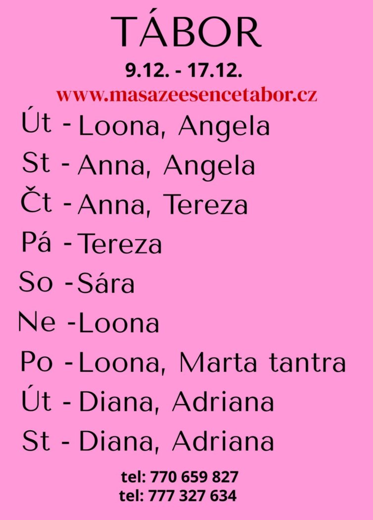 Vítám vás v salonu MASÁŽE ESENCE. Jsem SMYSLNÁ dívka co vás ráda potěší... JEDNÁ SE O EROTICKOU MASÁŽ S RUČNÍM VYVRCHOLENÍM. Je to velice hravá a intimní masáž do které zapojím nejen své ruce, ale i stehna, zadeček i prsa. Extra masáže: BDSM, FOODJOB, KOUPACÍ RITUÁL, SPORTOVNÍ MASÁŽ A DALŠÍ. MASÍRUJI CELÁ NAHÁ. Pro více informací volej: 770 659 827 nebo 777 327 634. DOPORUČUJI: délku masáže 60min. a z důvodu hlubšího prožitku 90min. Neváhej zavolat na uvedená telefonní čísla: 777 327 634 nebo 770 659 827.